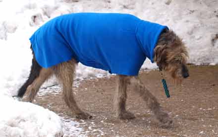 ich bin auf Dich/Sie? gestoßen bei der Suche nach einem Mantel für meinen Irish Wolfhound. Er wird dieses Jahr 10 Jahre alt und ist auch nicht mehr wirklich fit. Er hat Arthrose und Rheuma und lässt sich nicht mehr gerne bürsten. Deswegen halte ich seit diesem Sommer das Fell kurz weil er sonst verfilzt. Wenn es jetzt kalt wird möchte ich ihn auch schützen und wärmen.